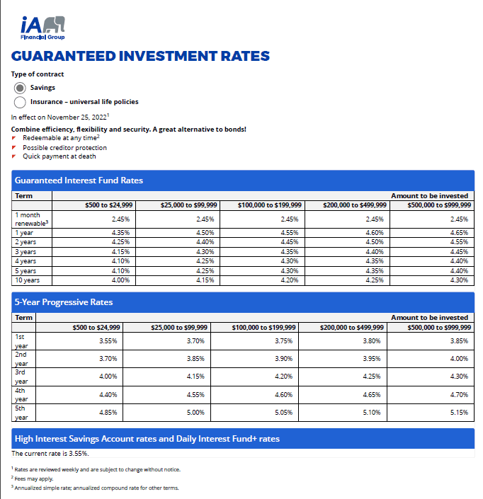 IA Financial – Guaranteed Investment Rates – Savings Nov 25, 2022.
