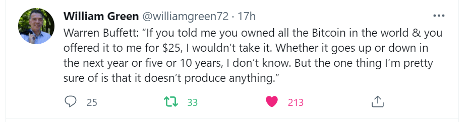 Warren: I shouldn’t answer this question but I will. I don’t want to step on your windpipe, but… IF people here owned all of the farmland in the U.S. and together they offered a 1% interest in the land for $25 billion. Or, you could own 1% of the apartment houses in the country and you offered that up for sale. You could write a cheque. Very simple. Now, if you offered me all of the Bitcoin in the world for $25, I would sell it back to you. I wouldn’t know what to do with it. It explains the difference between productive assets and speculative assets that are simply reliant upon a willingness of others to pay you for it.