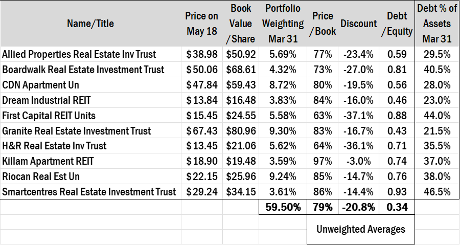 The table below lists the results of my inquiry. On Wednesday, May 18, all of our REITs were all selling below book value. Theoretically, the properties could be sold into the market place and unit holders would realize a gain on the difference between the REITs unit price and the underlying assets. In some instances, those discounts were 30% or more. An unweighted average suggests the top ten holdings are selling about 20% below their fair market price in aggregate.