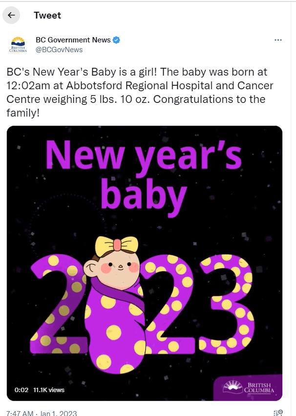 According to BC Government News, the first child born in BC was delivered at 12:02 Sunday morning at Abbotsford Regional Hospital to parents Arben Camayan and Thea Villaneuva..