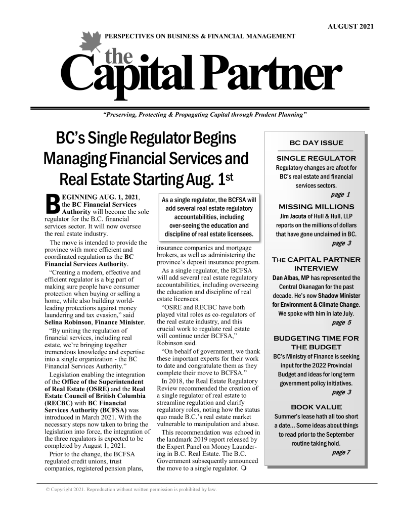 - BC Single Financial Regulator (inc. Real Estate) Starts August 1st